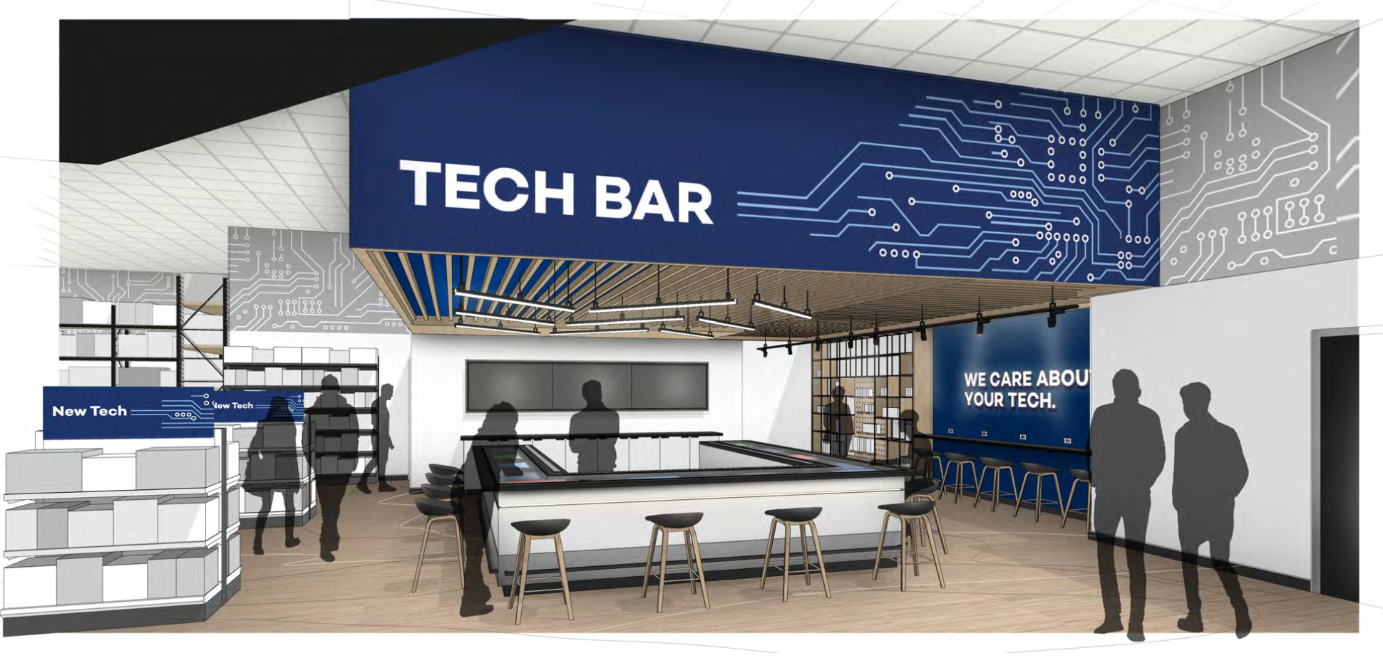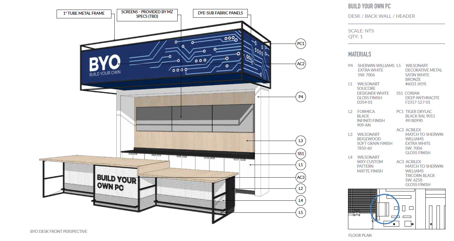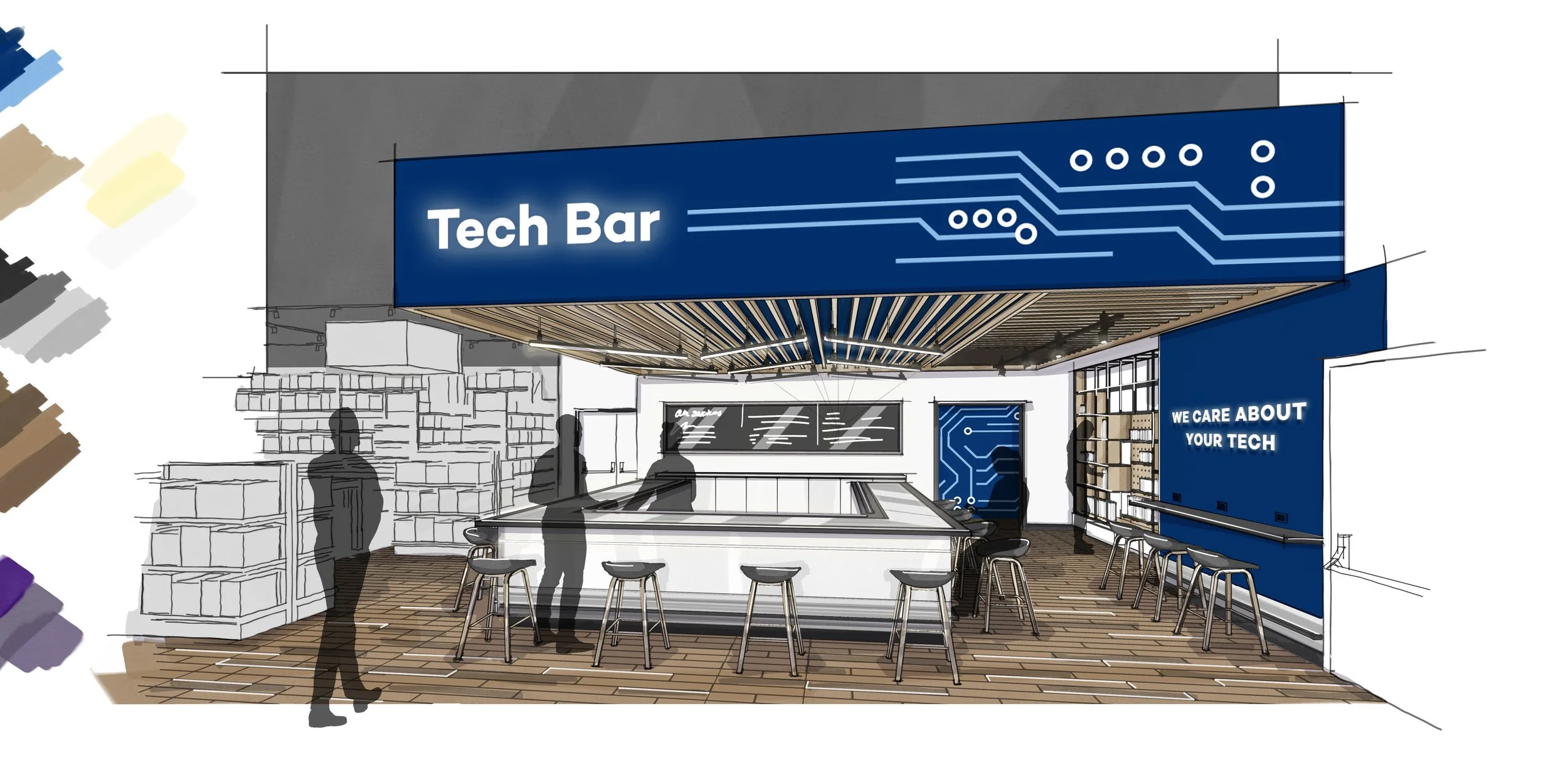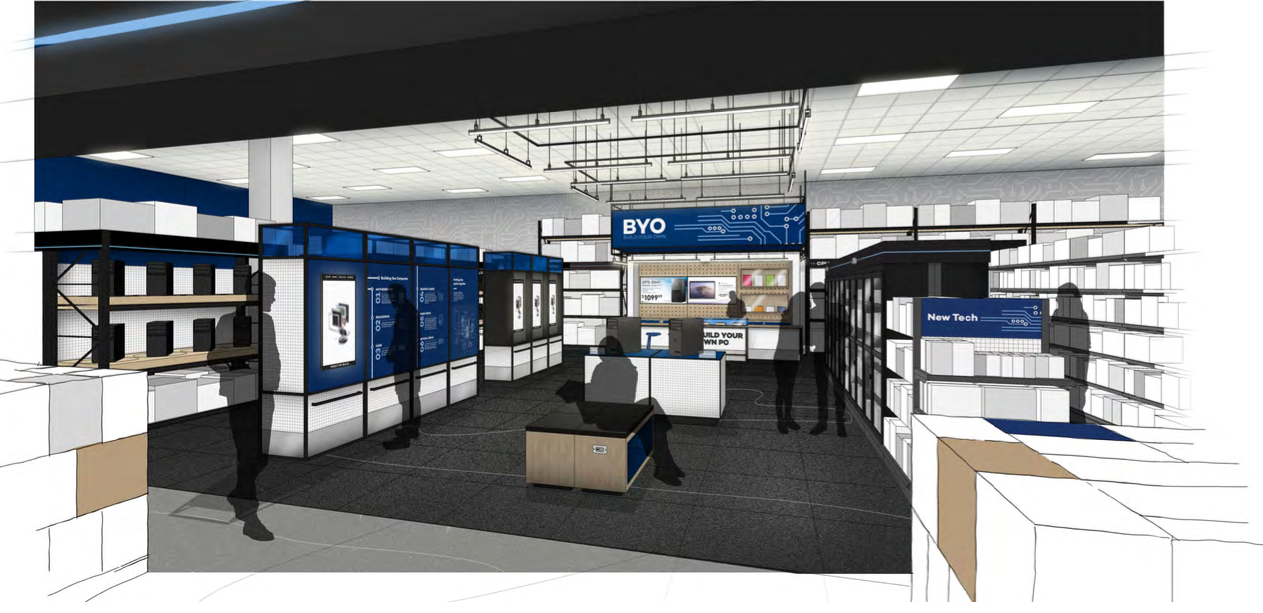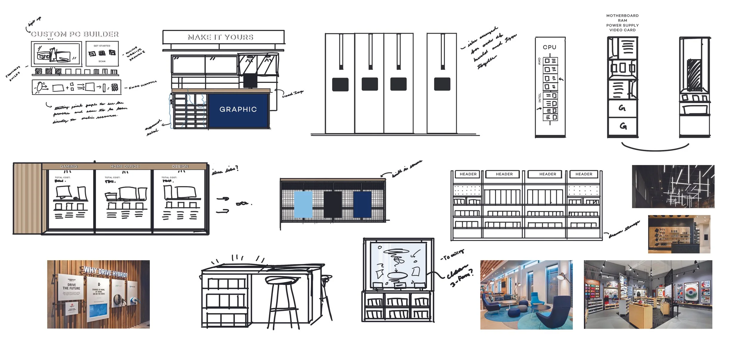 After the design direction was chosen, we moved into concept design reimagining the space and how it functions. I was responsible for three departments within the scope: the Tech Bar, Build Your Own, and Order Pickup.